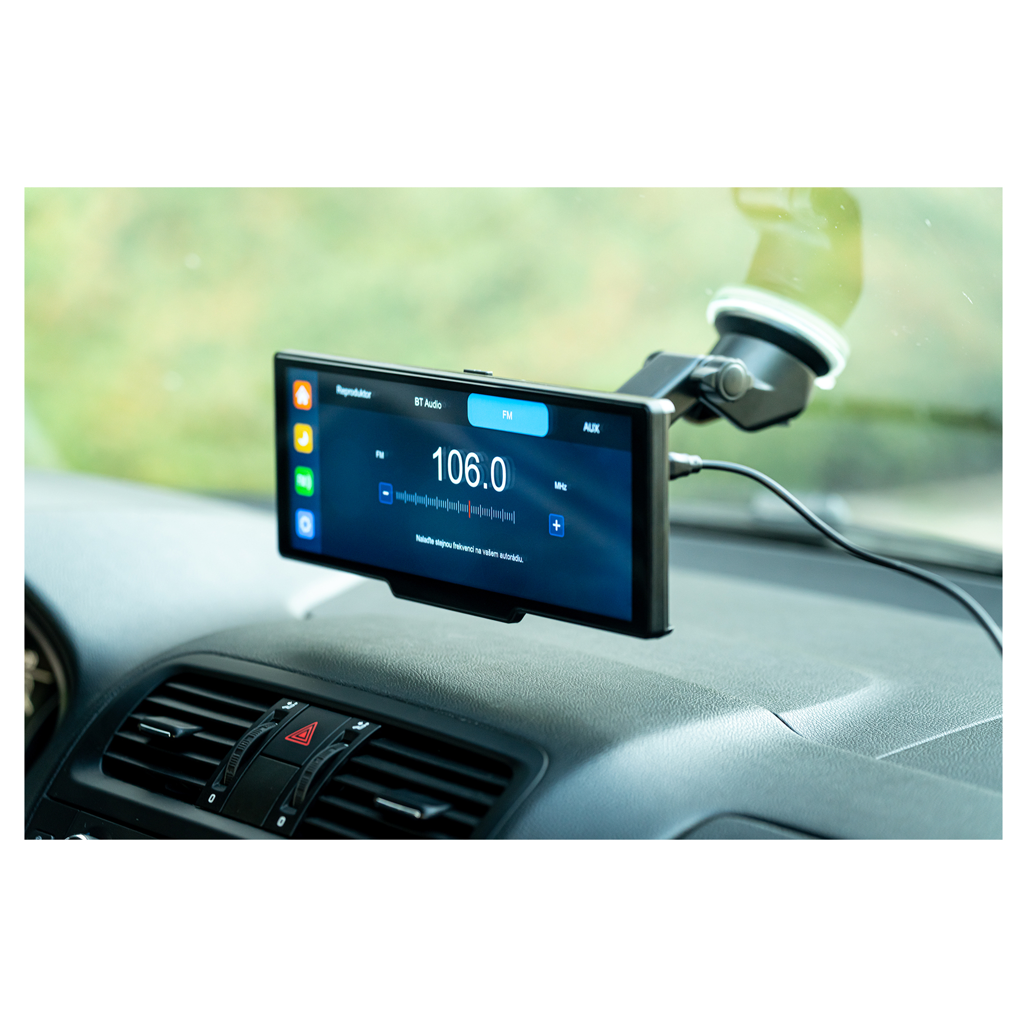 - Bezdrôtový prenos zvuku do reproduktorov vozidla cez FM