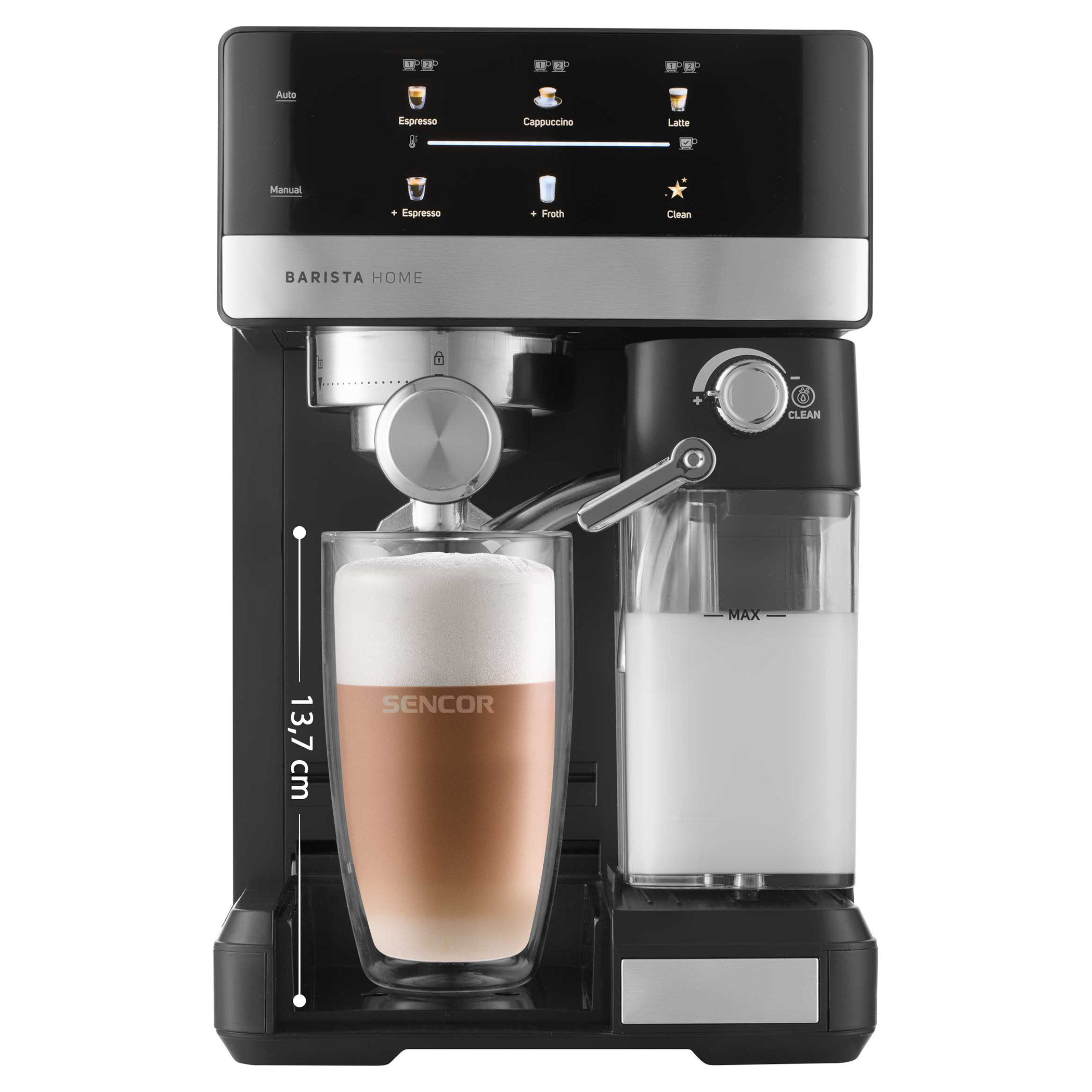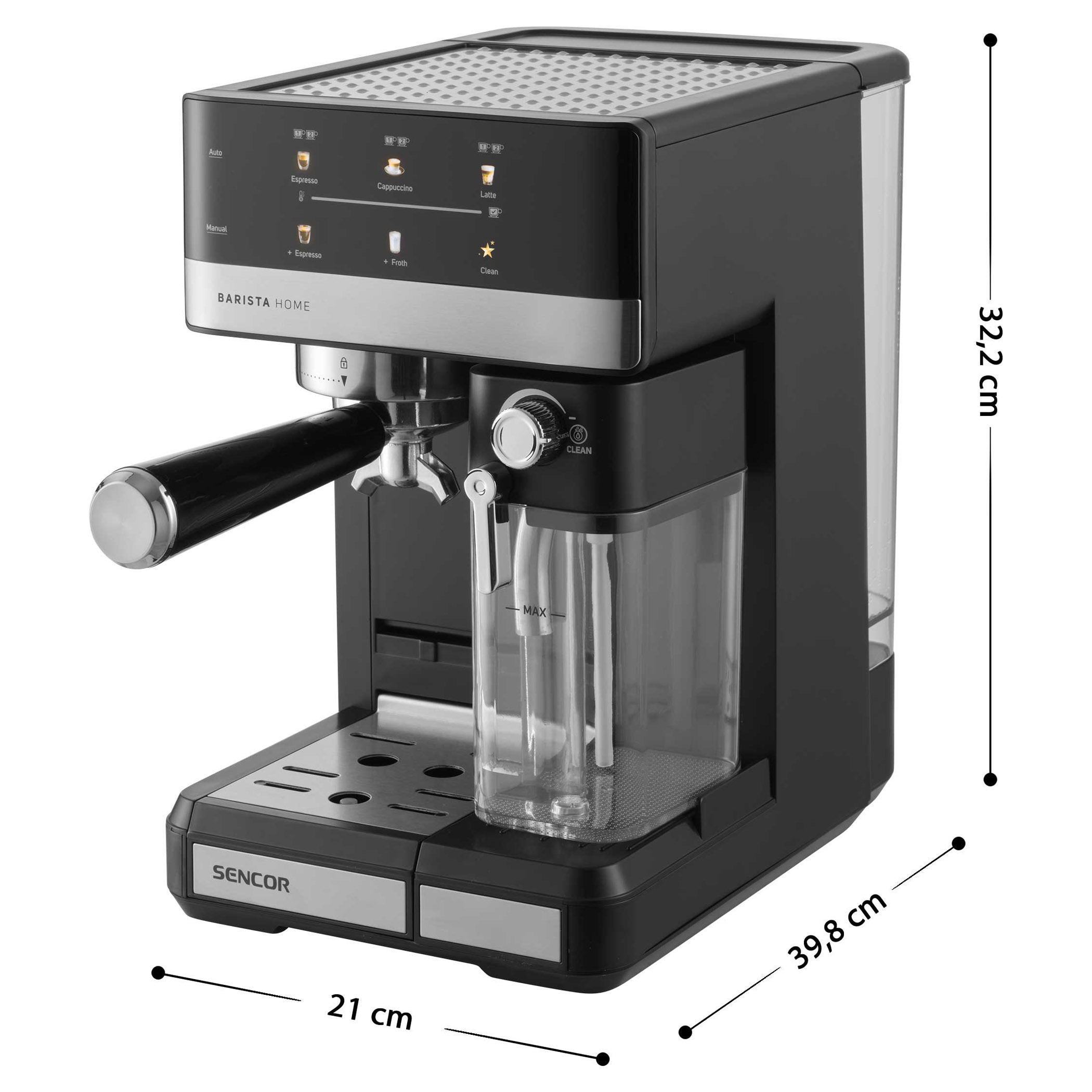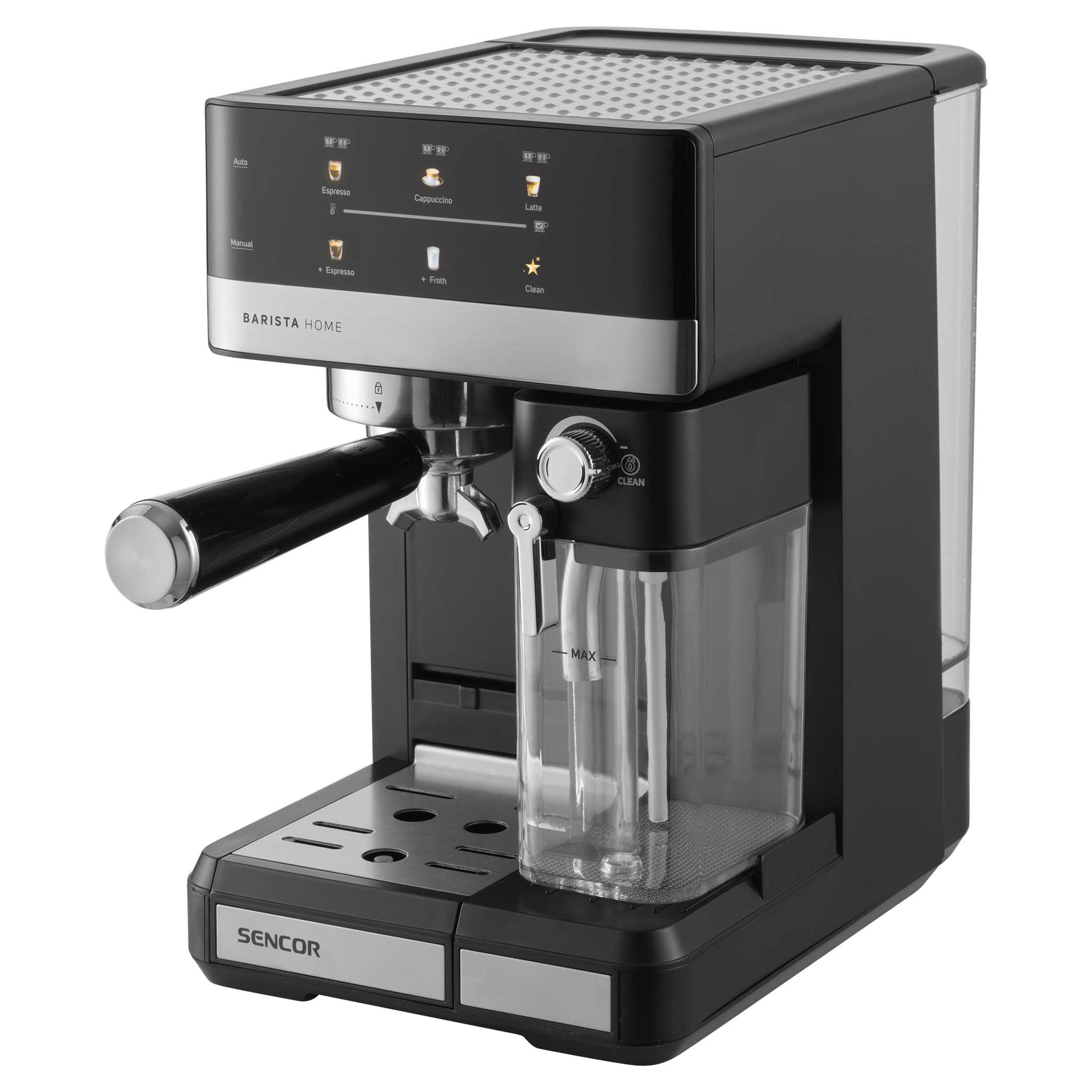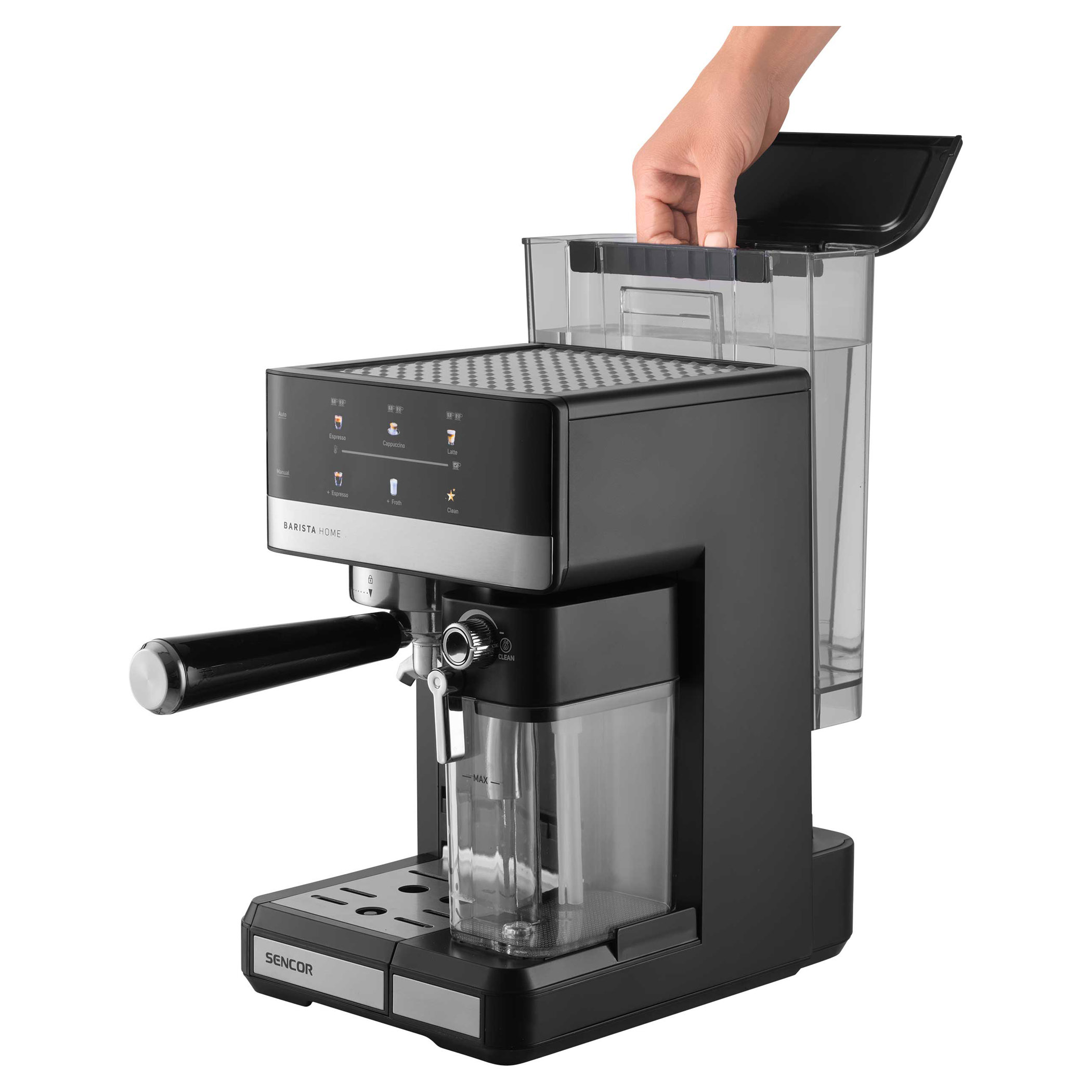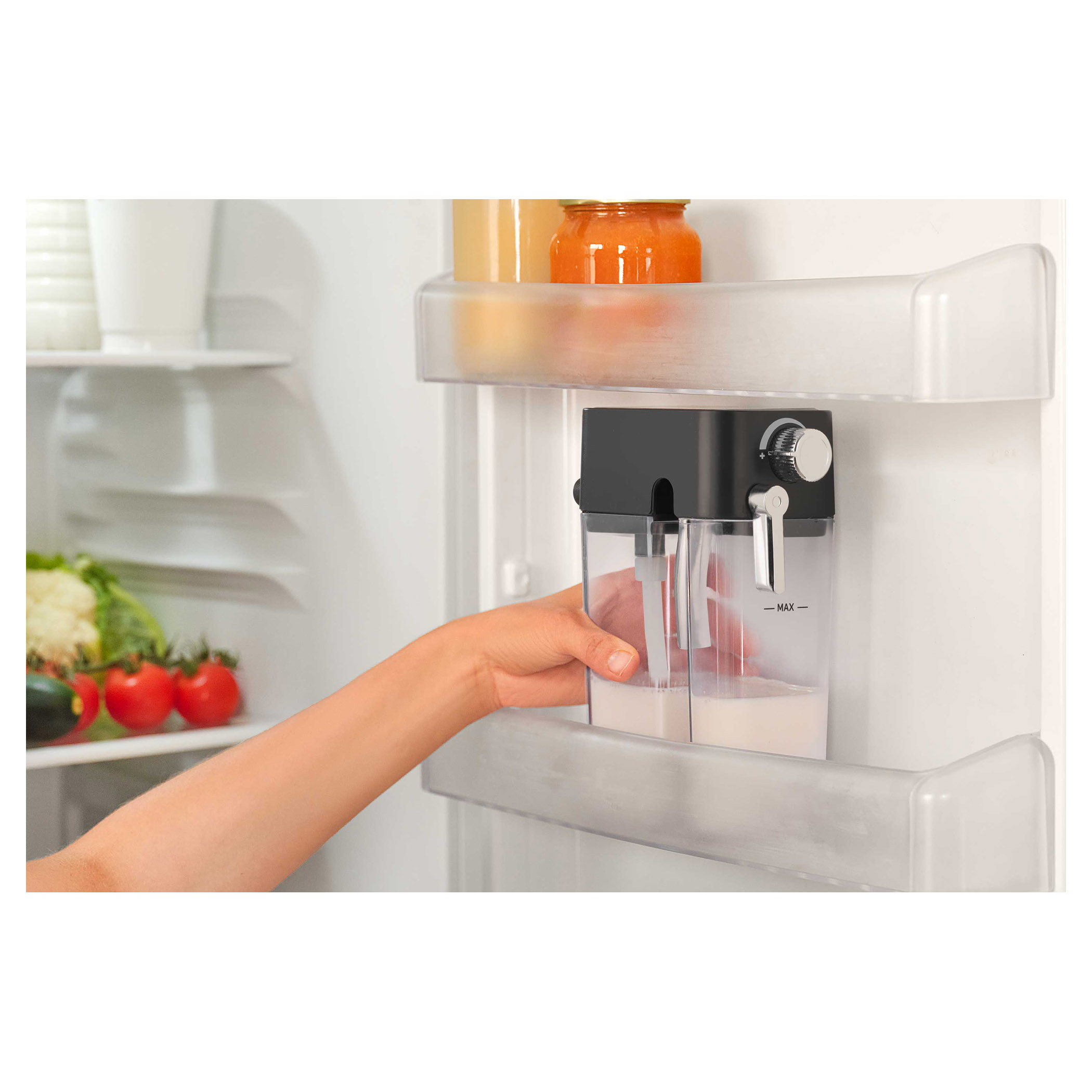 • Odnímateľná priehľadná nádržka na mlieko s objemom 500 ml s odnímateľným zariadením na napenenie mlieka