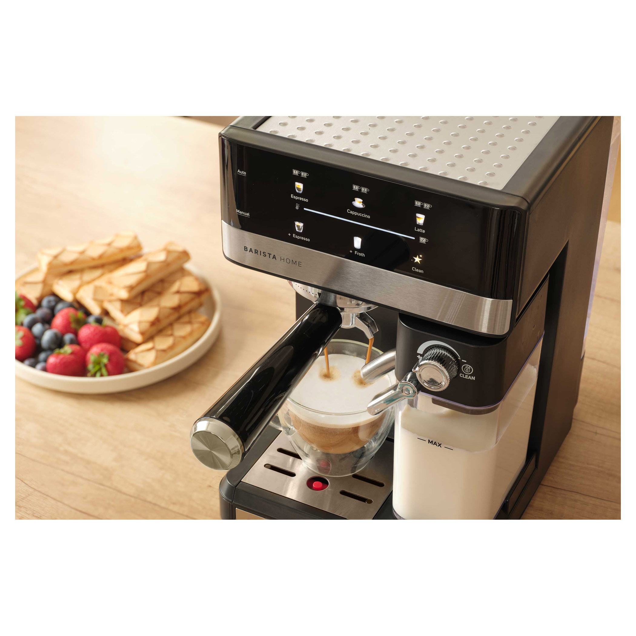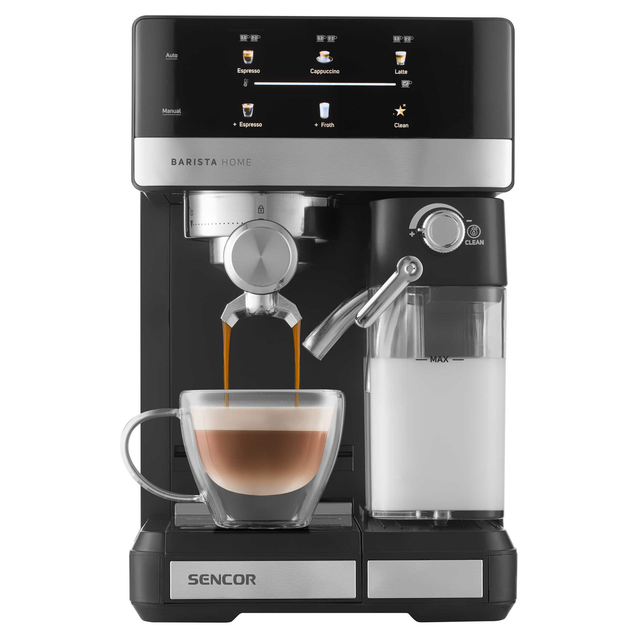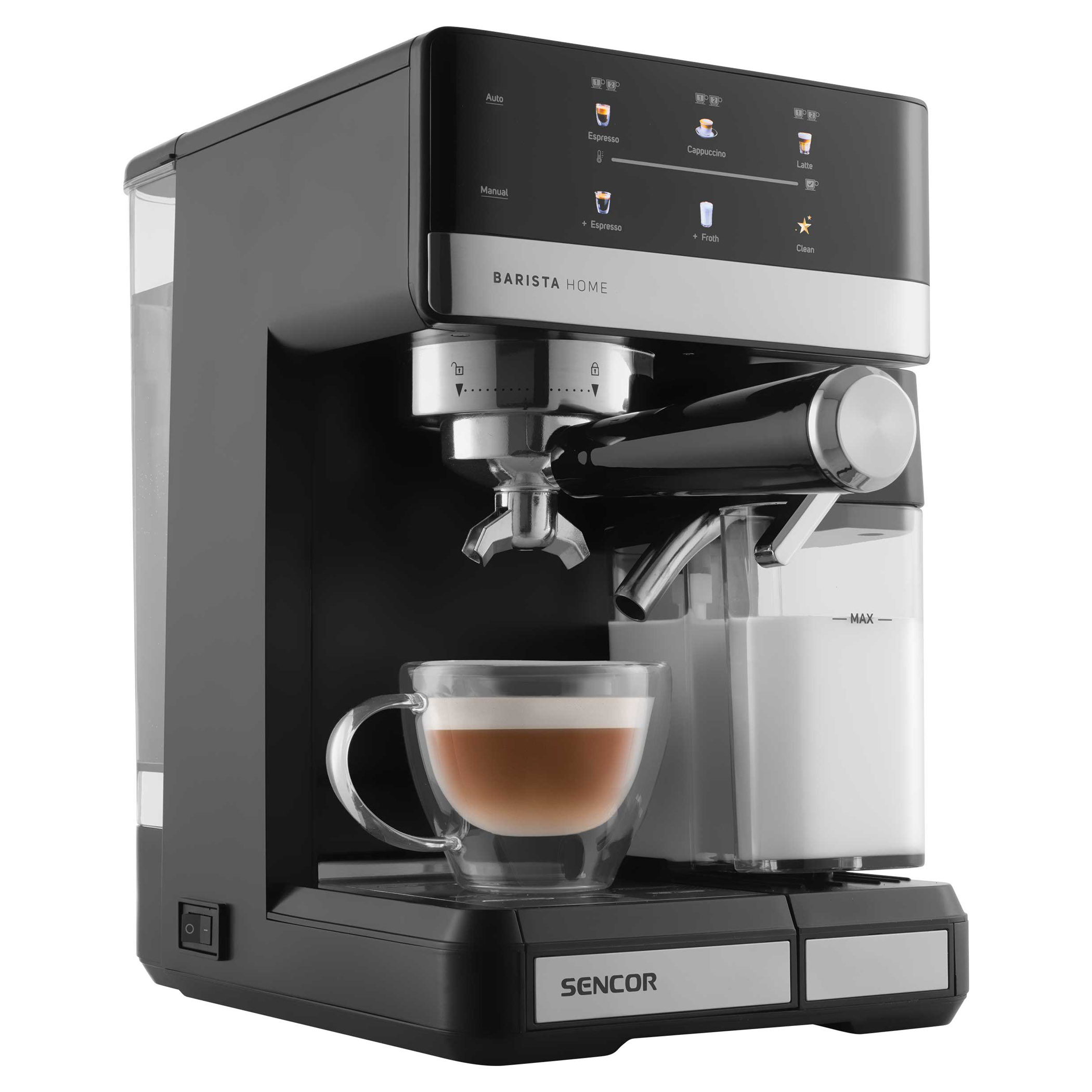 Vychutnajte si doma kávu baristickej kvality s týmto prémiovým automatickým kávovarom. Je vybavený výkonným tlakovým čerpadlom s tlakom 20 barov a pokročilým systémom ohrevu termoblokom, ktorý pri každom varení prináša bohaté a aromatické espresso. Integrovaný systém automatického napenenia mlieka vám umožní vytvoriť krémové cappuccino, hladké latte alebo jednoducho napeniť mlieko s nastaviteľným nastavením peny - to všetko stlačením jediného tlačidla. Odnímateľná nádržka na mlieko s objemom 500 ml a odnímateľná jednotka na napenenie mlieka uľahčujú čistenie, pričom špeciálny čistiaci program zabezpečuje trvalú hygienu. Digitálny displej s intuitívnymi farebnými ikonami uľahčuje obsluhu a funkcie, ako je funkcia predsparenia, ohrievač šálok a automatické vypnutie, zvyšujú vaše pohodlie. Kávovar je navrhnutý tak, aby sa doň zmestili všetky šálky od espressa až po vysoké hrnčeky, a obsahuje filtre z nehrdzavejúcej ocele na jednu alebo dve šálky, držiak filtra a tamper s naberačkou - všetko, čo potrebujete, aby ste si mohli vychutnať kávu ako z kaviarne v pohodlí vašej kuchyne.
