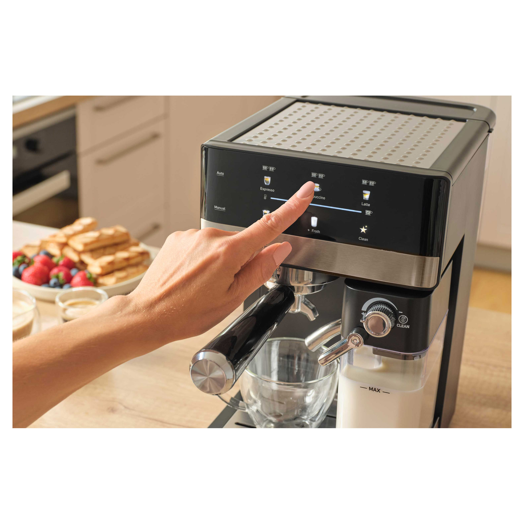 • Automatický systém napeňovania mlieka s nastaviteľnou veľkosťou peny• Automatické programy len pre Cappuccino, Latte alebo napenené mlieko