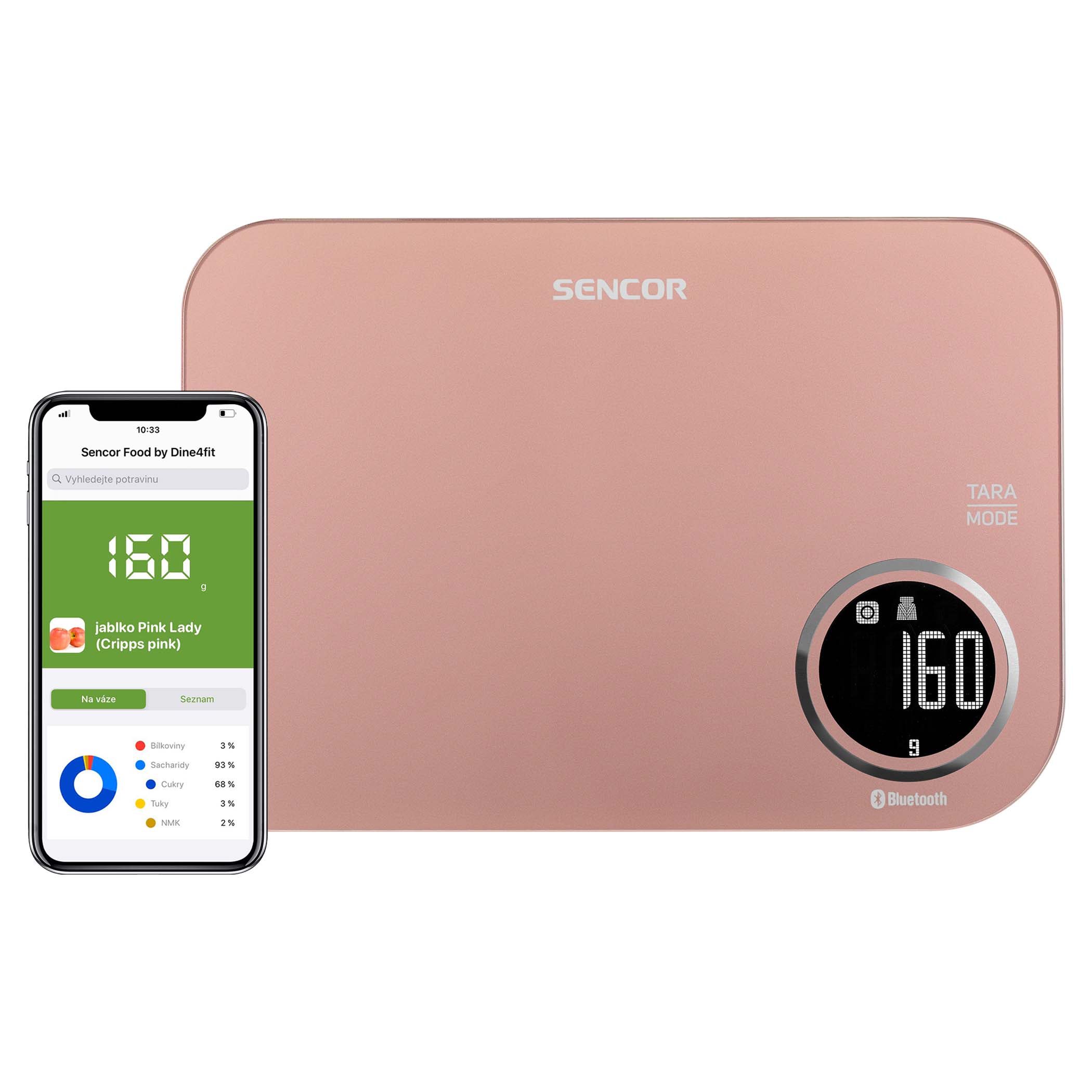 Váha je vybavená bezdrôtovou technológiou Bluetooth, ktorá v spojení s bezplatnou aplikáciou Sencor FOOD nainštalovanou do vášho inteligentného zariadenia ponúka priamy prístup k bohatej a pravidelne aktualizovanej databáze potravín a ich nutričným hodnotám.Aplikácia Sencor FOOD bola vyvinutá v spolupráci s tvorcami aplikácie Kalorické Tabuľky/Dine4Fit a je určená pre smartfóny s operačným systémom iOS (verzia 13 a vyššia) alebo Android (verzia 5 a vyššia). Pri používaní aplikácie musí byť telefón pripojený na internet.