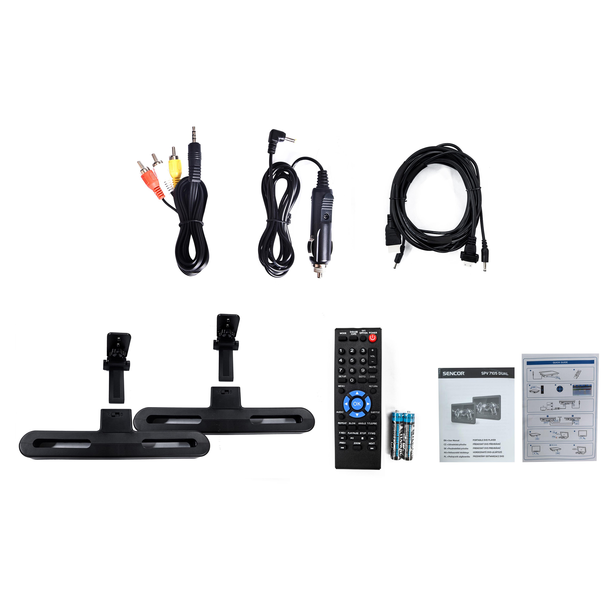 - Príslušenstvo: nabíjačka do auta, napájací adaptér, diaľkový ovládač, batérie, návod na obsluhu, držiak na opierku hlavy u auta *