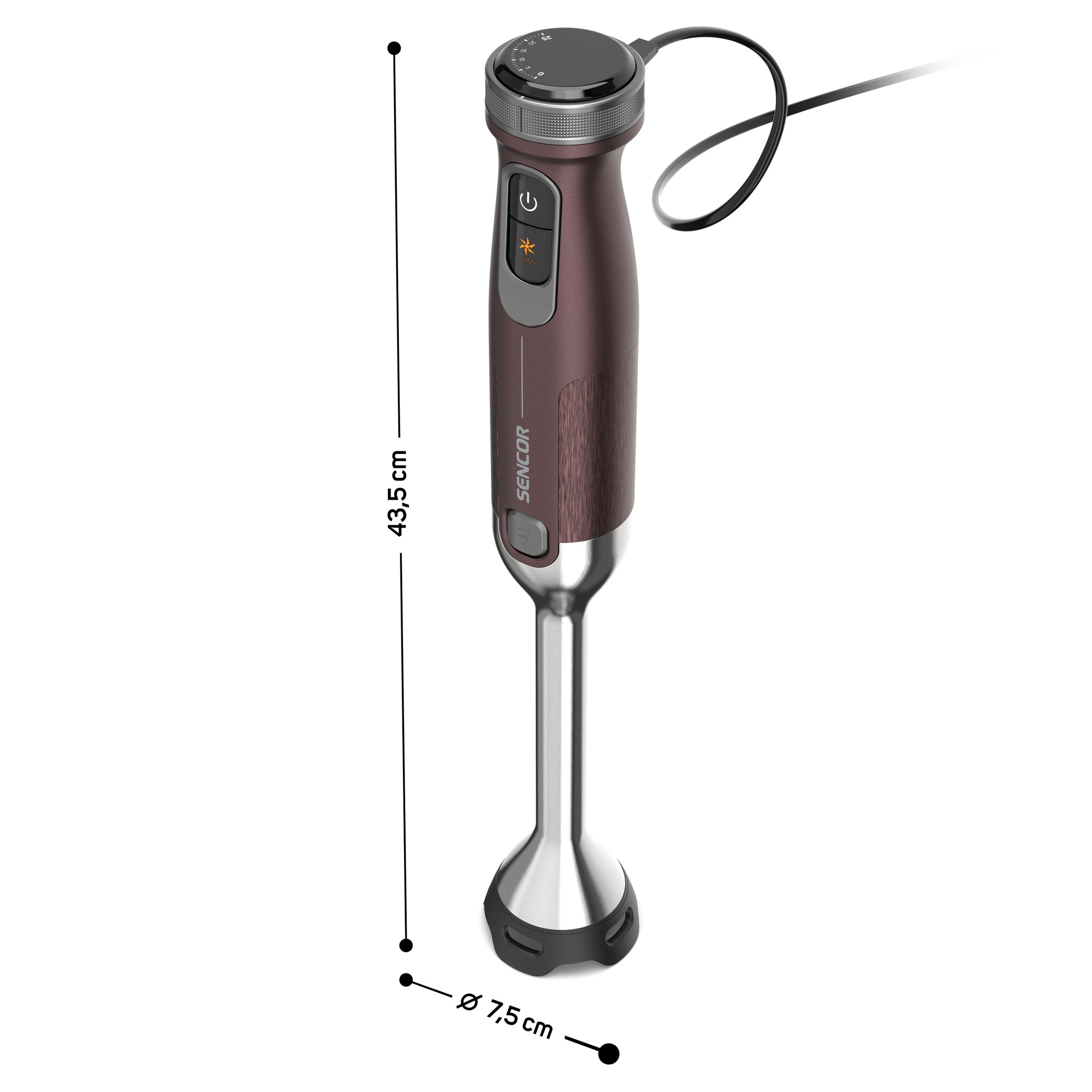 - Rozmery tyčového mixéra (š × h × v): 7,5 × 7,5 × 43,5 cm