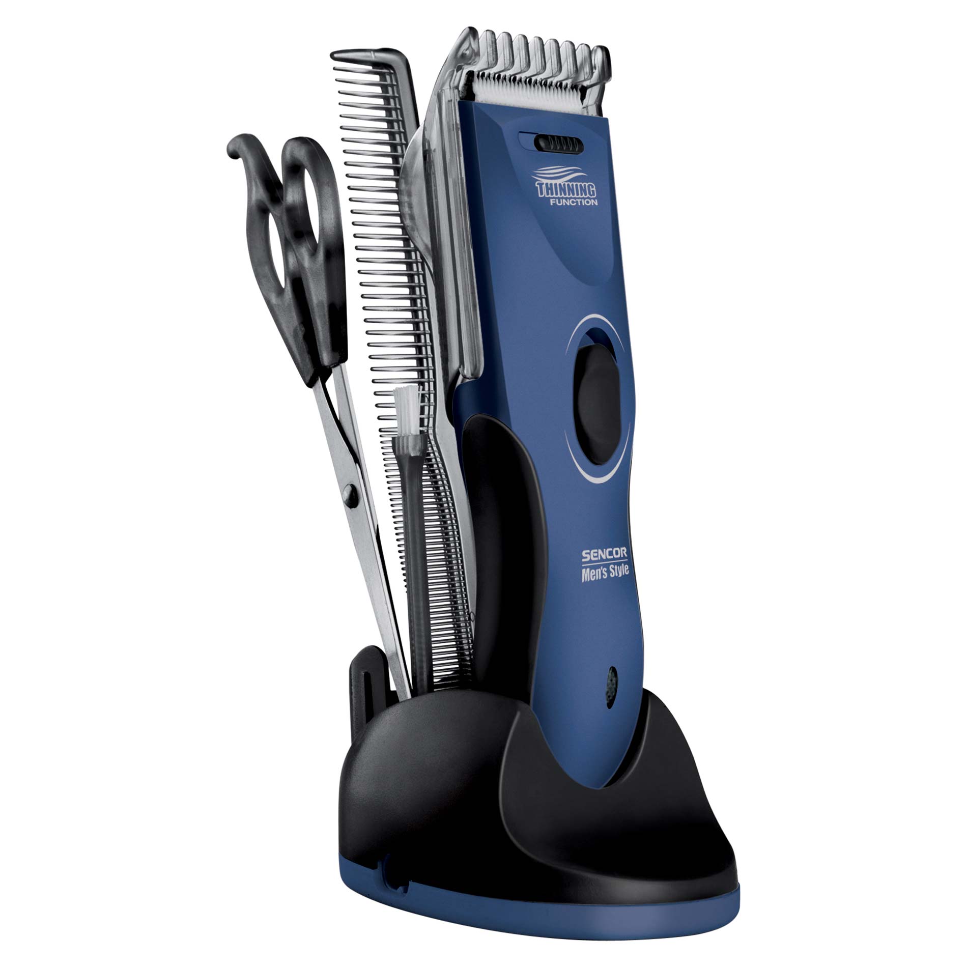 Dodávané príslušenstvo: nabíjacia základňa s držiakom príslušenstva, dobíjací / napájací adaptér, 2 hrebeňové nadstavce, hrebeň, nožnice, čistiaca kefka, olej do strihacej jednotky